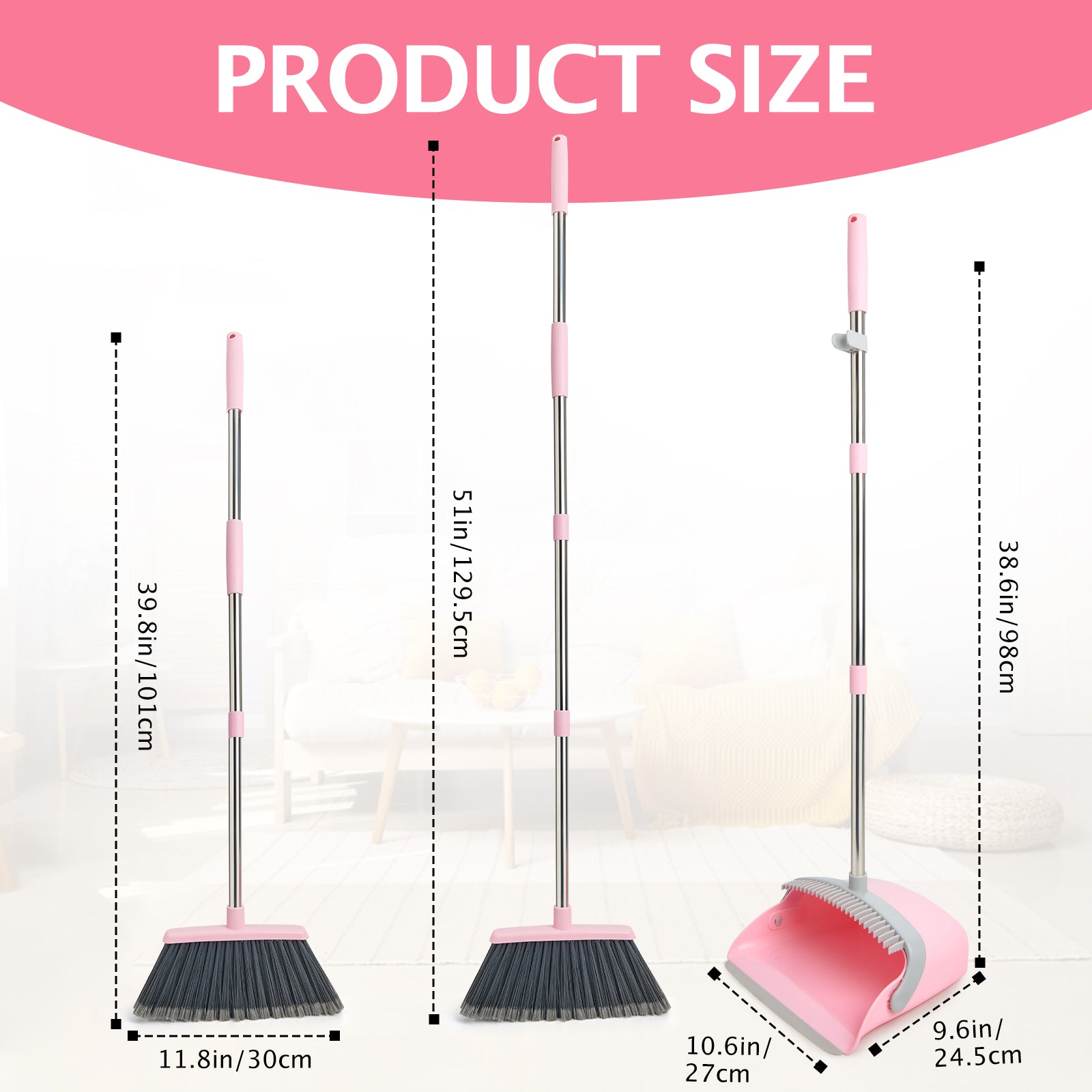 - 【Extendable Handle】The optional extension pole makes the broom length from 39.8 inches to 51 inches, the dustpan length is 38.6 inches. You can choose the appropriate length according to your height, making it easy to clean while standing upright.